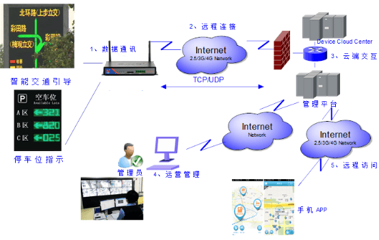 ◆停车场信息采集终端与中央管理系统之间的车位数据通信以及中央管理系统与诱导屏之间的通信,由于诱导屏安装在道路路侧,不便于敷设通信电缆,因此建议均采用无线通讯手段,实现系统内的数据通讯,如我们采用的3G/4G网络。